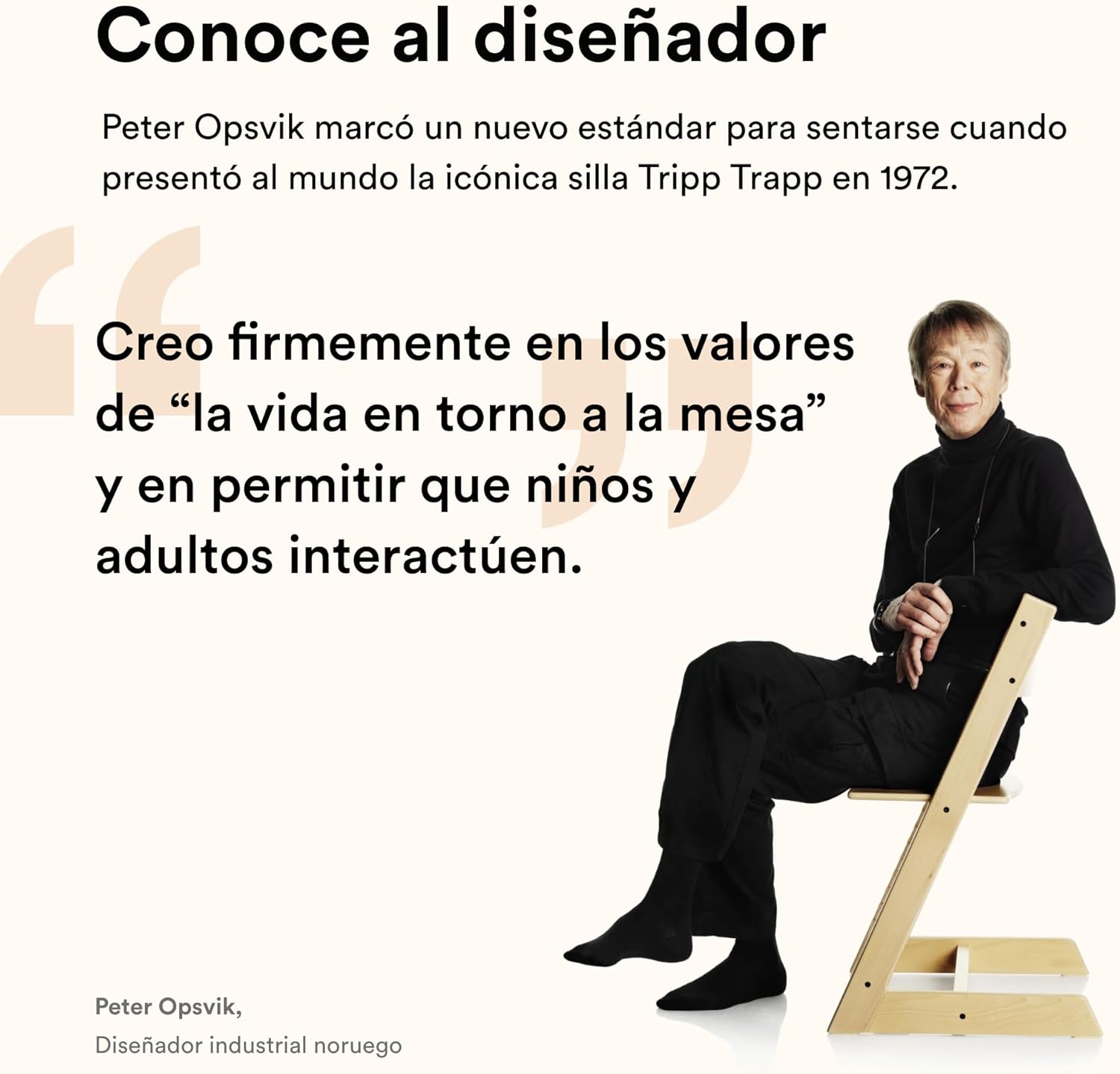 Desde los primeros días hasta la adultez, la Tripp Trapp acompaña cada etapa con su diseño ajustable, cómodo y ergonómico.